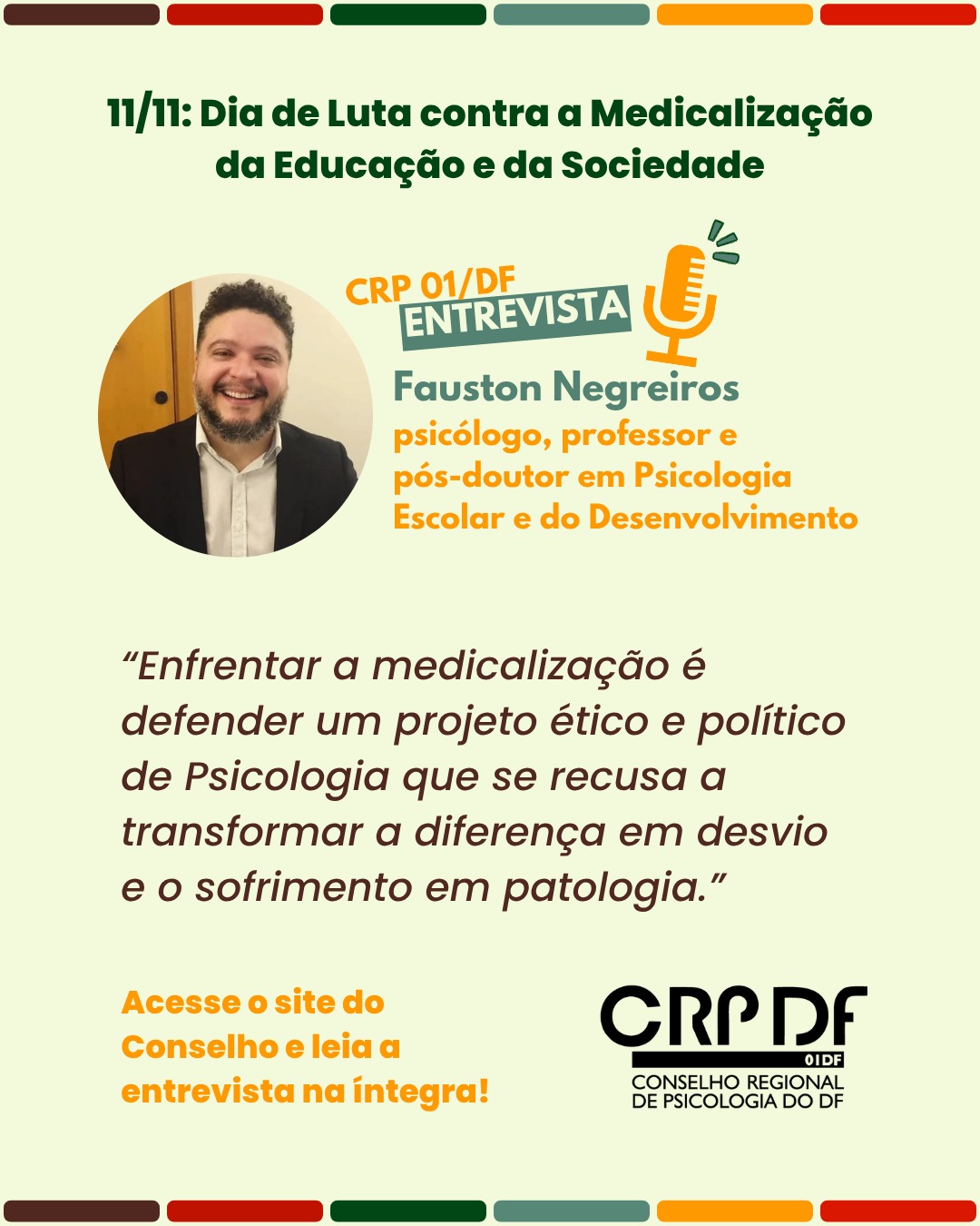 Para discutir esse tema, o Conselho Regional de Psicologia do Distrito Federal entrevistou o professor Fauston Negreiros, psicólogo, pós-doutor em Psicologia Escolar e do Desenvolvimento pela USP, docente do Instituto de Psicologia da Universidade de Brasília (UnB) e presidente da Associação Brasileira de Psicologia Escolar e Educacional (ABRAPEE). Sua trajetória acadêmica e atuação política estão fortemente ligadas à defesa de uma Psicologia Escolar Crítica, comprometida com práticas emancipatórias e com o enfrentamento das desigualdades que atravessam o cotidiano das escolas públicas brasileiras.