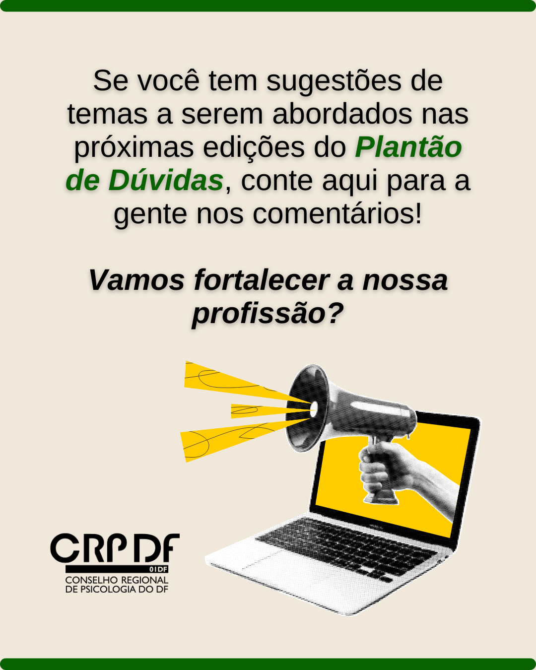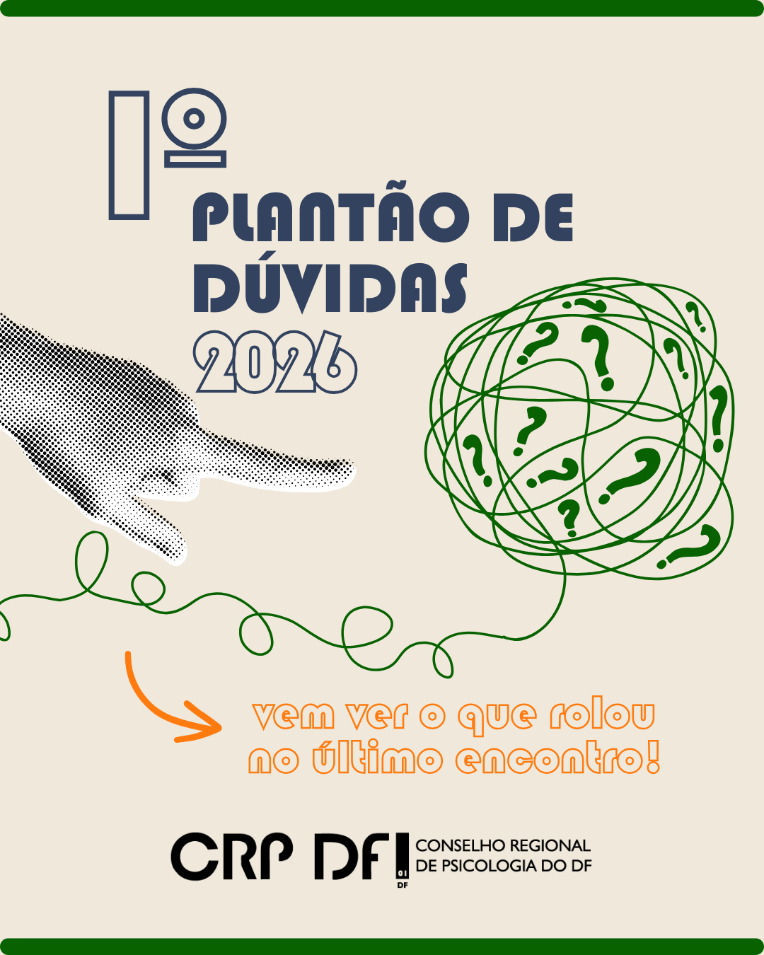 #descreviparavocê: carrossel composto por sete imagens que mostram os principais assuntos discutidos no primeiro encontro de 2026 do projeto Plantão de Dúvidas do CRP 01/DF. Aparece a ilustração de um balão de diálogo formado por pontos de interrogação e fios que vão se desenrolando e mãos indicando destaques nas imagens. Há um registro das pessoas presentes na última reunião on-line, que aparece na tela de um computador, além de ilustrações de uma bússola, um computador, um cadeado e um megafone saindo da tela de um laptop.