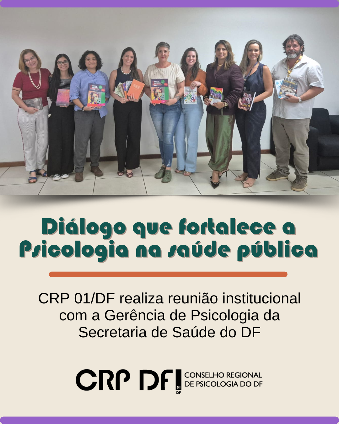#descreviparavocê: card colorido contendo registro fotográfico da reunião institucional entre o CRP 01/DF e a a Gerência de Psicologia da SES/DF. Aparece uma chamada para leitura do relato da reunião e a marca gráfica do CRP 01/DF.