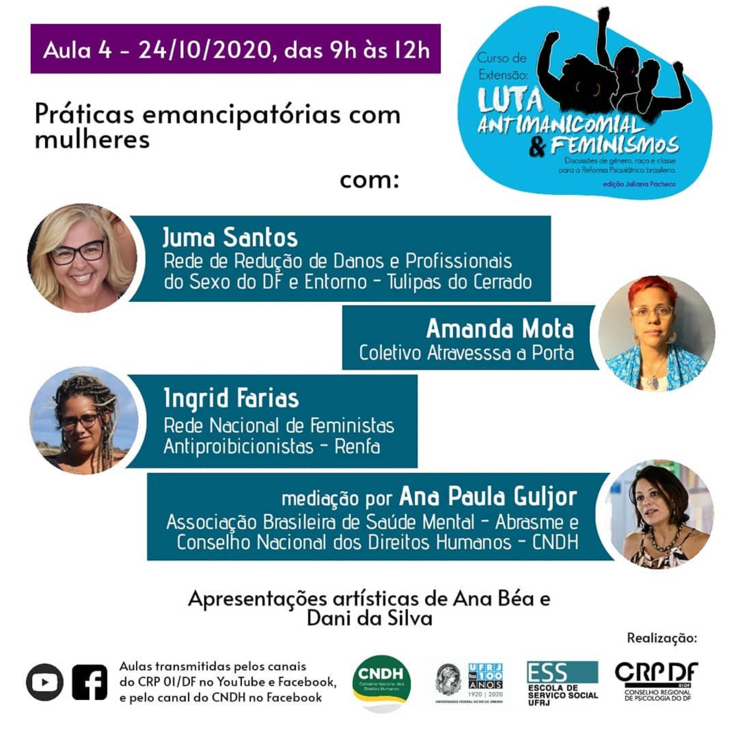 Em 2020, o CRP 01/DF realizou, em parceria com o Conselho Nacional dos Direitos Humanos (CNDH) e Escola de Serviço Social (ESS) da Universidade Federal do Rio de Janeiro (UFRJ), o curso "Luta antimanicomial e feminismos: discussões de gênero, raça e classe para a Reforma Psiquiátrica brasileira". Você pode assistir às quatro aulas, transmitidas no canal do CRP 01/DF no YouTube, clicando sobre os títulos ou sobre as imagens:
