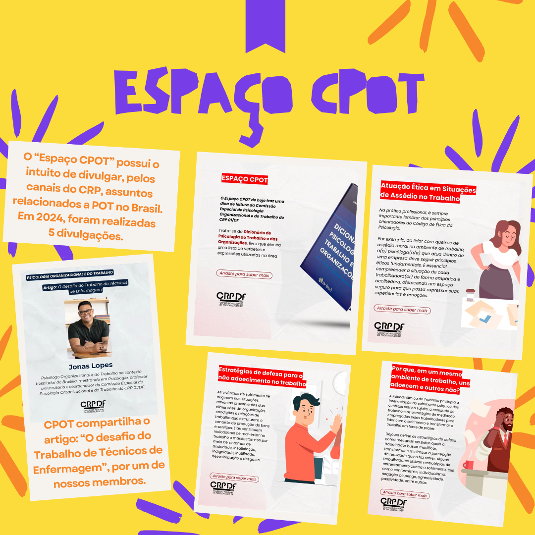 O “Espaço CPOT” possui o intuito de divulgar, pelos canais do CRP, assuntos relacionados a POT no Brasil. Em 2024, foram realizadas cinco divulgações.