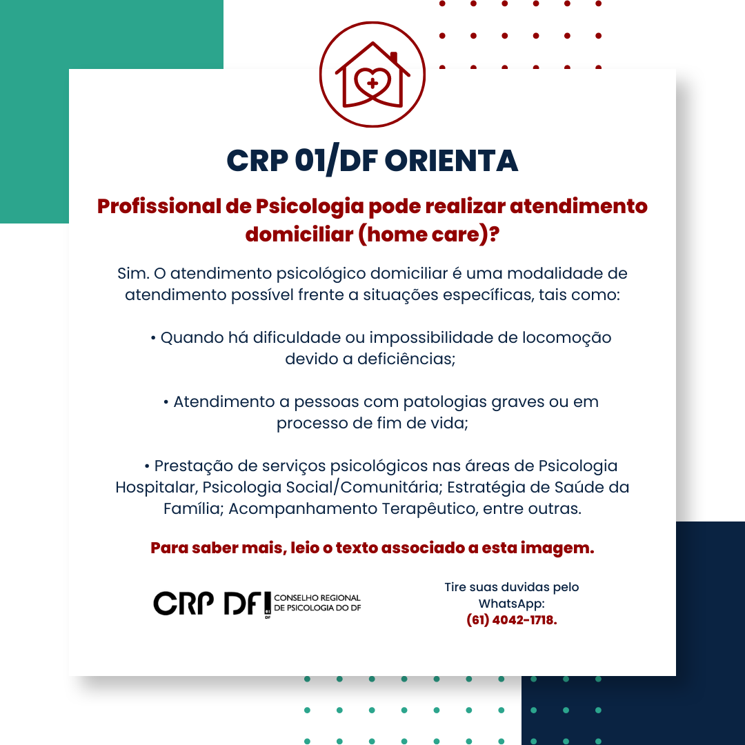 Para mais detalhes, acesse o CRP 01/DF ORIENTA com 4 cards sobre o tema “Atendimento psicológico domiciliar (home care)”, no site do Conselho: https://www.crp-01.org.br/page_3969/