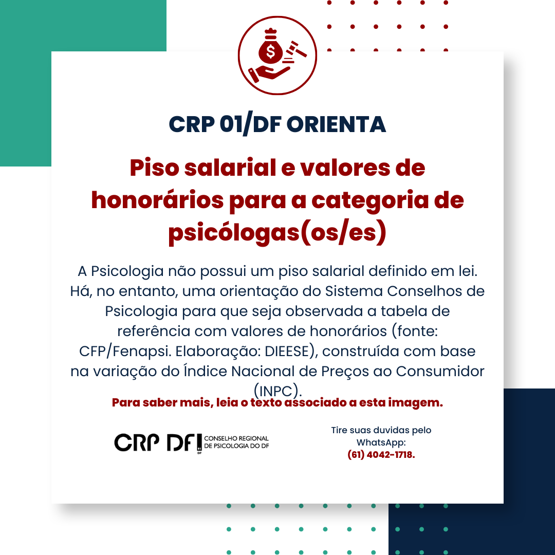 A Psicologia não possui um piso salarial definido em lei. Há, no entanto, uma orientação do Sistema Conselhos de Psicologia para que seja observada a tabela de referência com valores de honorários (fonte: CFP/Fenapsi. Elaboração: DIEESE), construída com base na variação do Índice Nacional de Preços ao Consumidor (INPC).