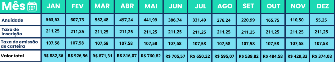 Os valores dos boletos são proporcionais ao mês em que a solicitação de inscrição é feita.